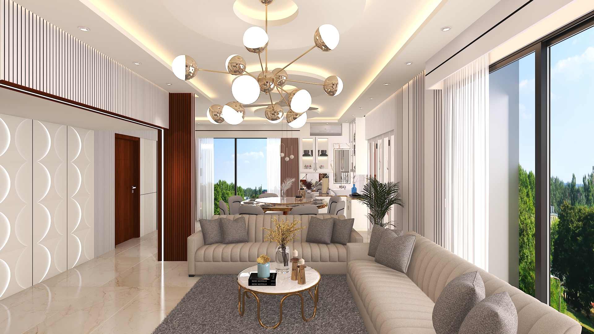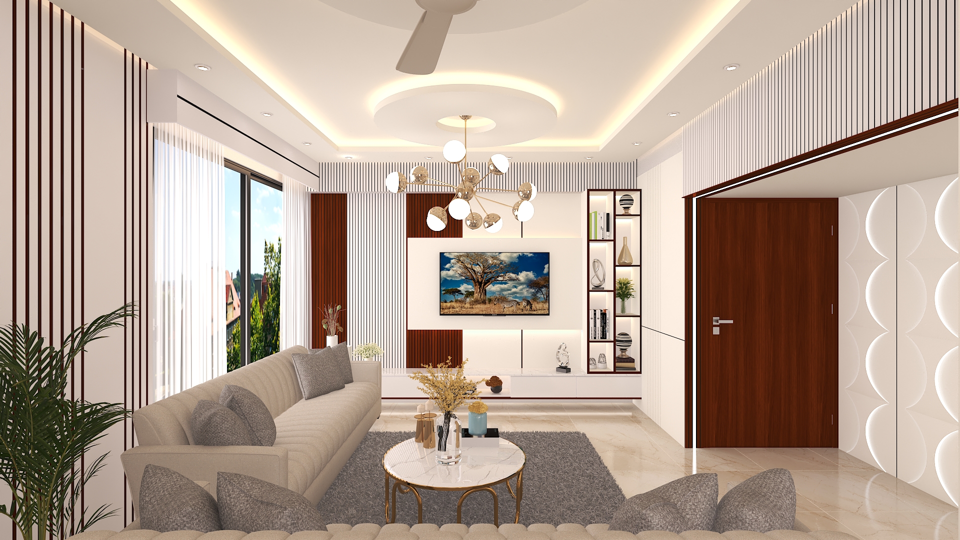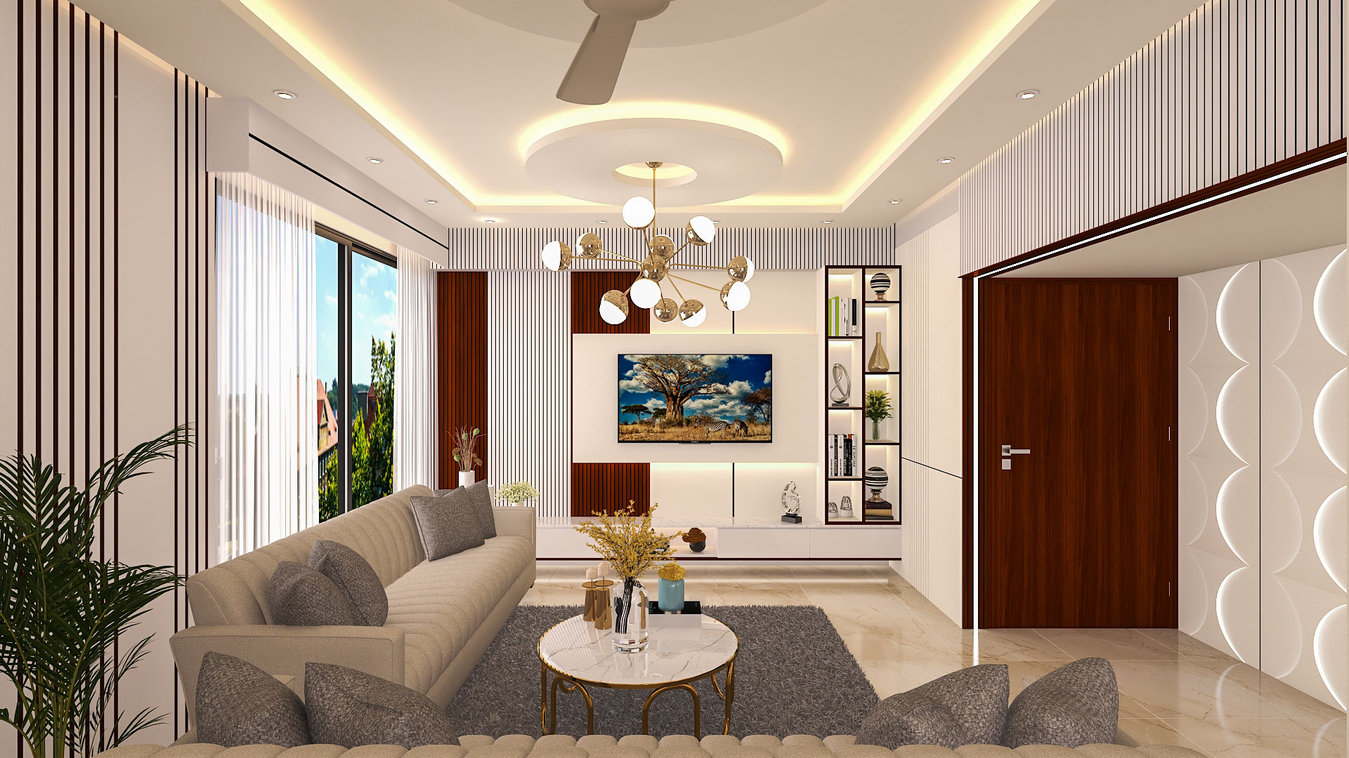 TV unit, feature wall, false ceiling, lighting, sofa arrangement |