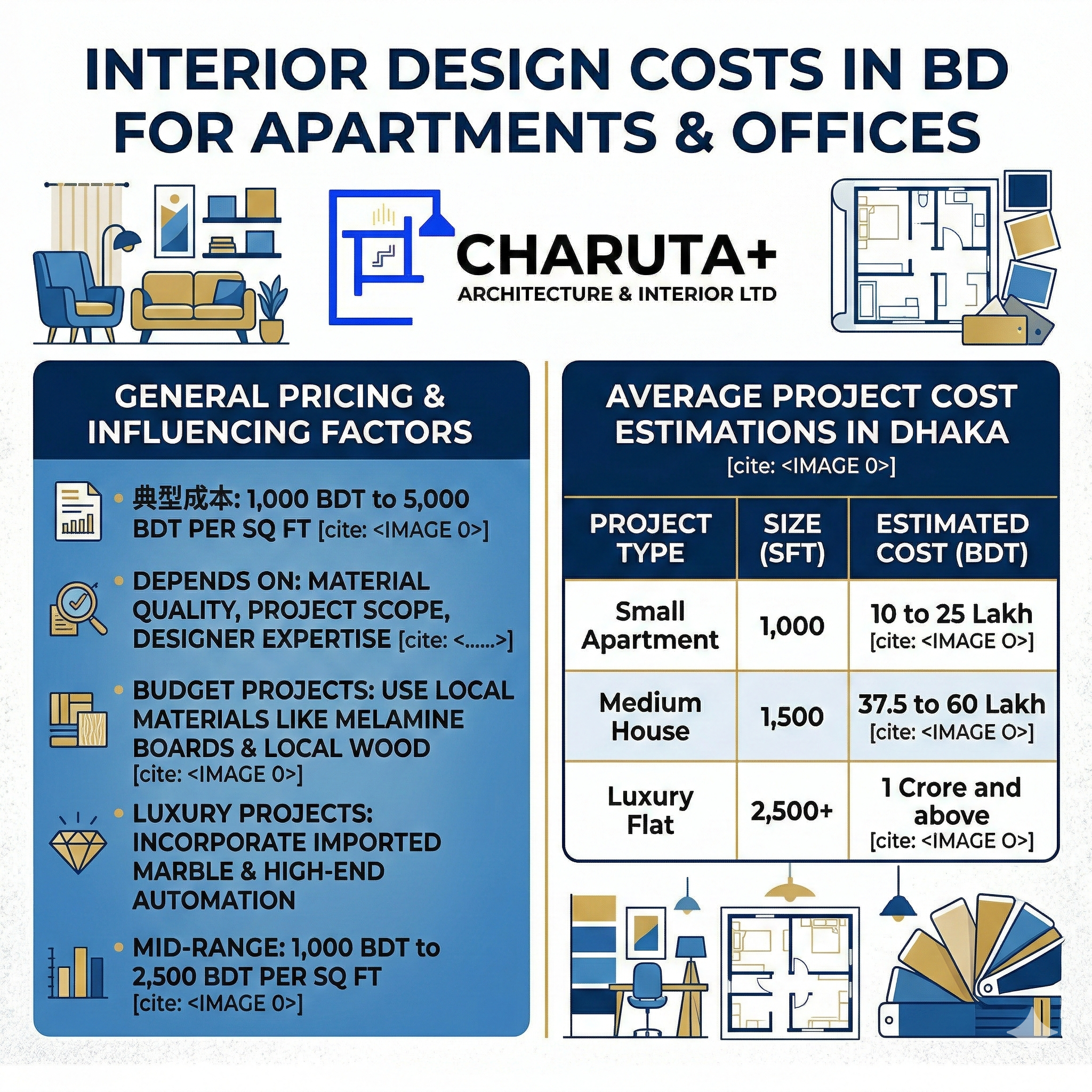 The average interior design rate per square foot in Bangladesh is 1,000 BDT to 2,500 BDT for mid-range projects. Luxury projects exceeding 5,000 BDT per square foot include imported finishes and automation.