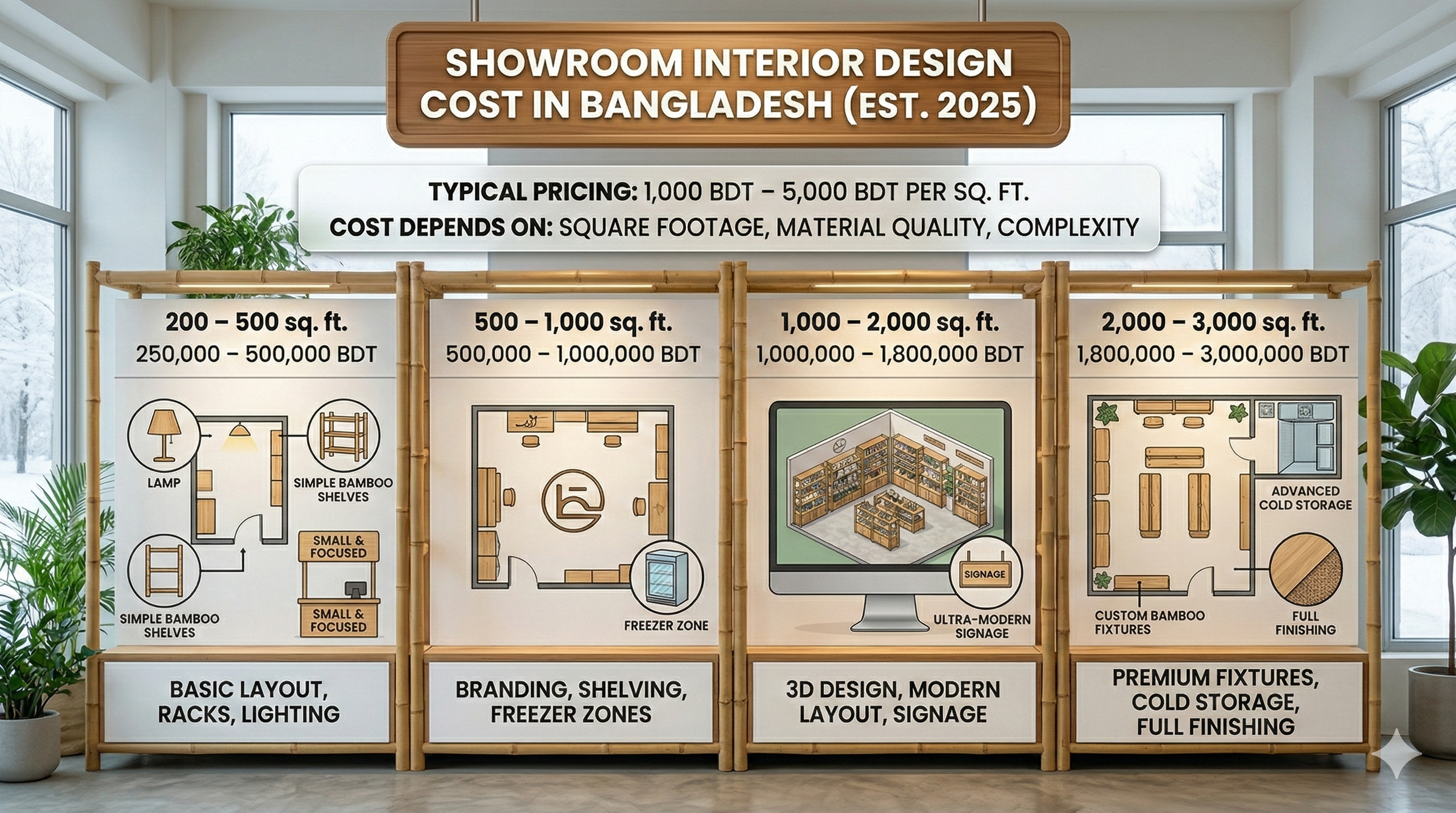 The cost of a showroom project in Bangladesh depends on the square footage, material quality, and complexity. Pricing in 2025 typically ranges from 1,000 BDT to 5,000 BDT per square foot.
