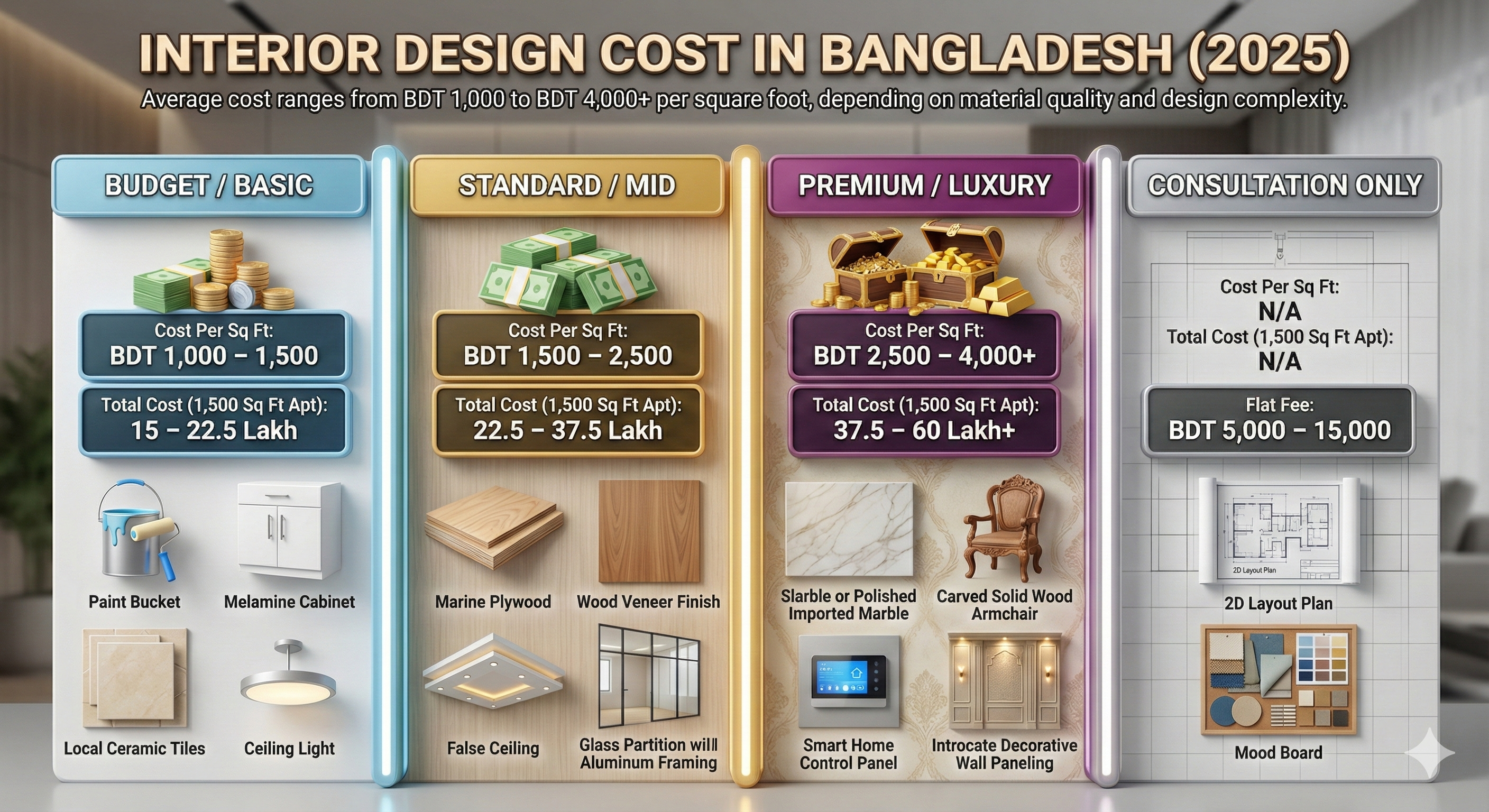 The average interior design cost in Bangladesh ranges from BDT 1,000 to BDT 4,000+ per square foot, depending on material quality and design complexity.